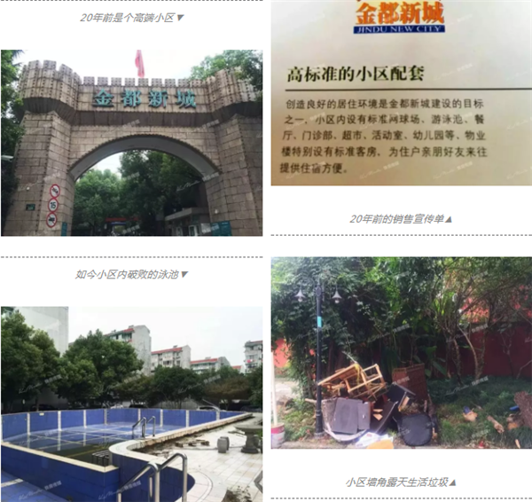 可20年后的今天,金都花园呈现的是一派衰落景象:小区两个紧挨着的游泳池,里面空空如也,瓷砖破旧,几根水管横七竖八地堆放在地上,游泳池边上长满了杂草,表明已经多年不用了……