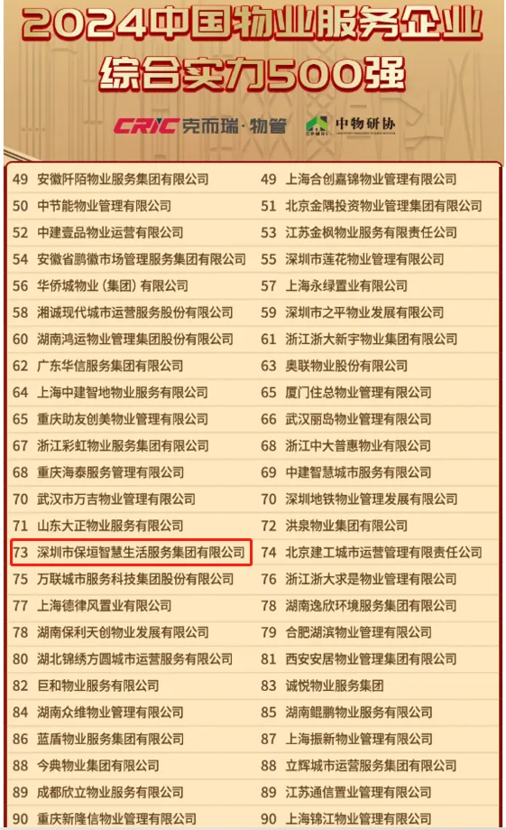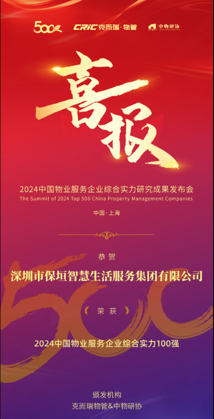 喜报 | 保垣智慧生活荣获“2024中国物业服务企业综合实力100强”奖项